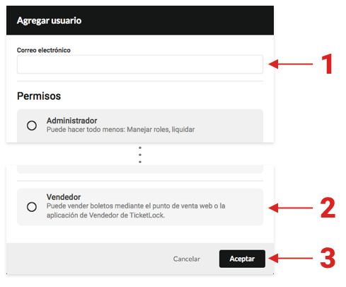 - Ingresa el correo electrónico del usuario de TicketLock que se desea agregar como vendedor.